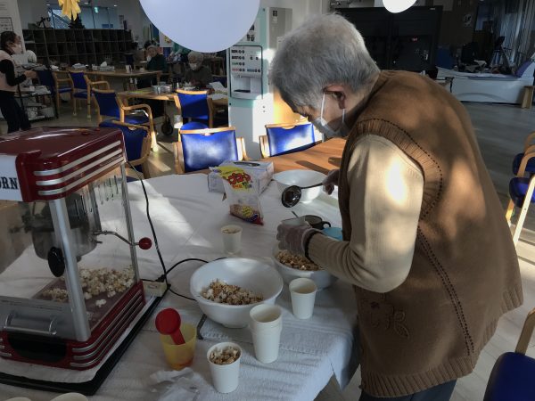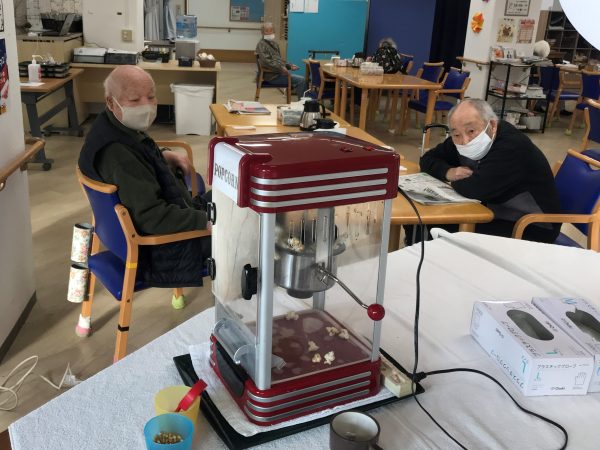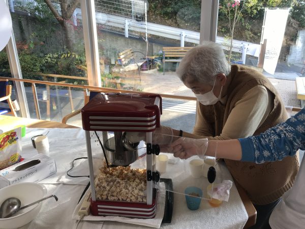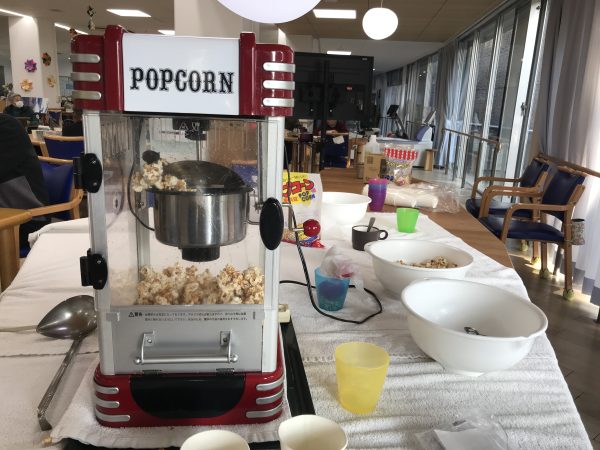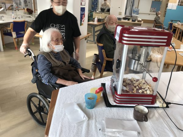 昭和時代の遊園地にあったようなポップコーンメーカーに、利用者さまも釘付けです。