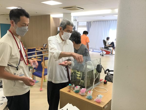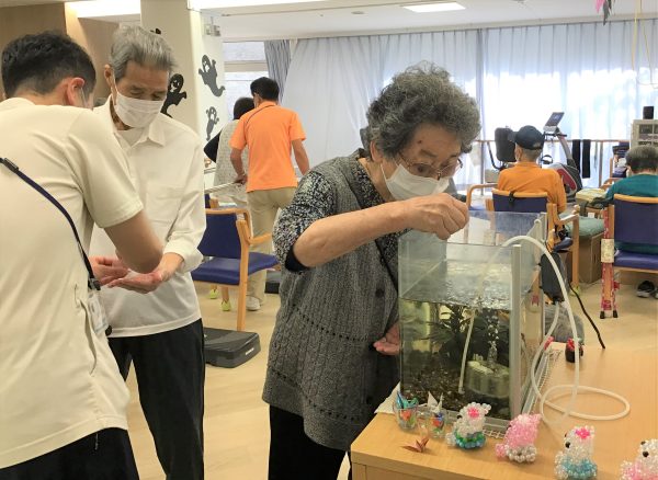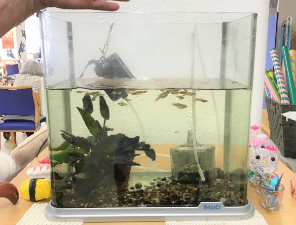 利用者さま見守られ、飼育中のメダカとグッピーがグングン成長しています。