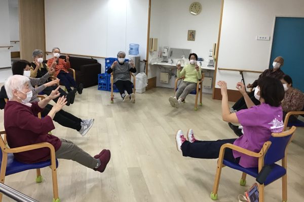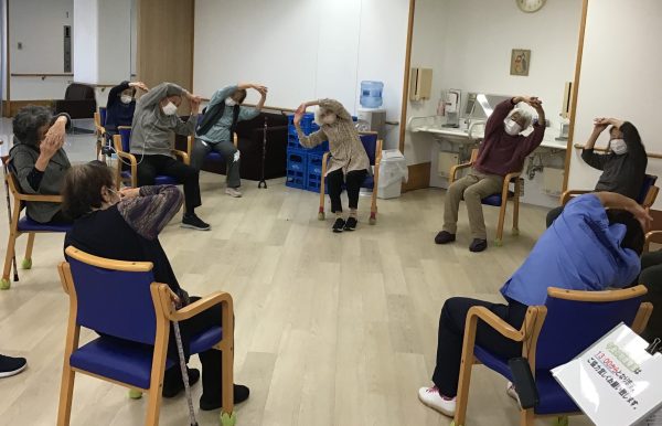デイサービスでは、今日も日課の体操に取り組んでおります。