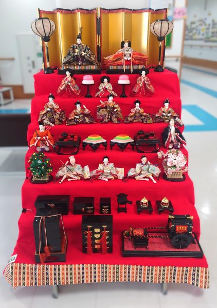 さて、桃の節句が迫っているということで、正面玄関にひな人形を飾りました🎎
