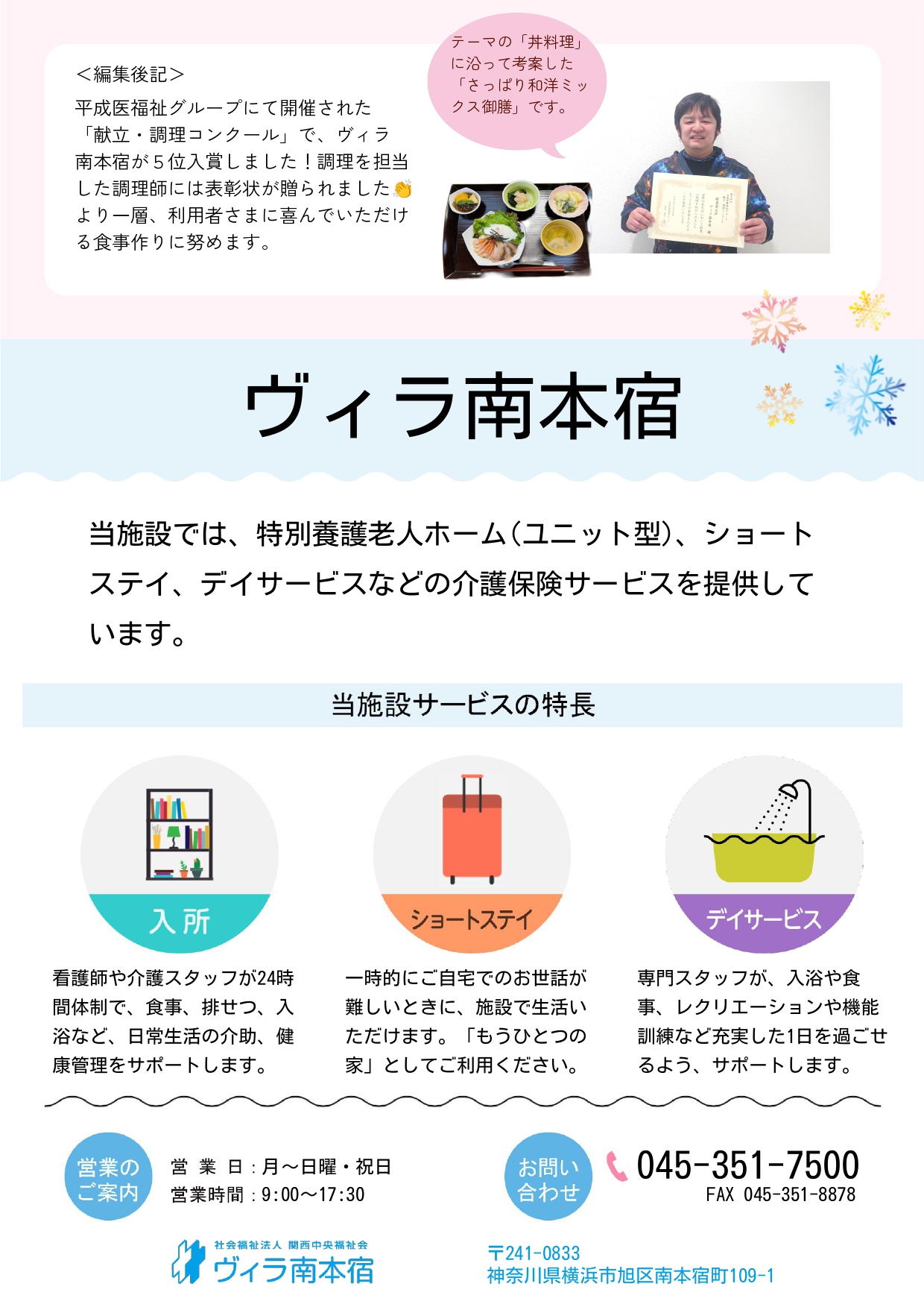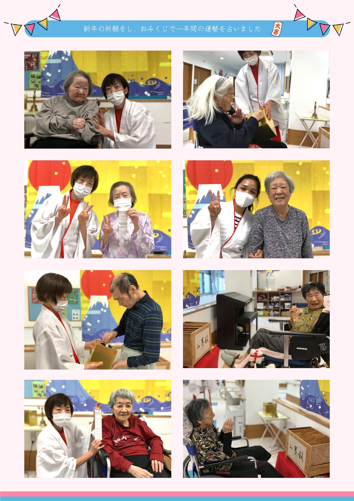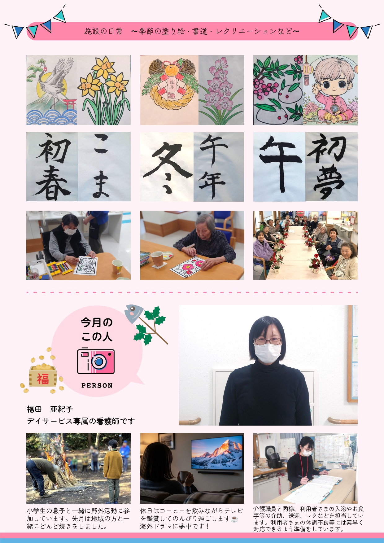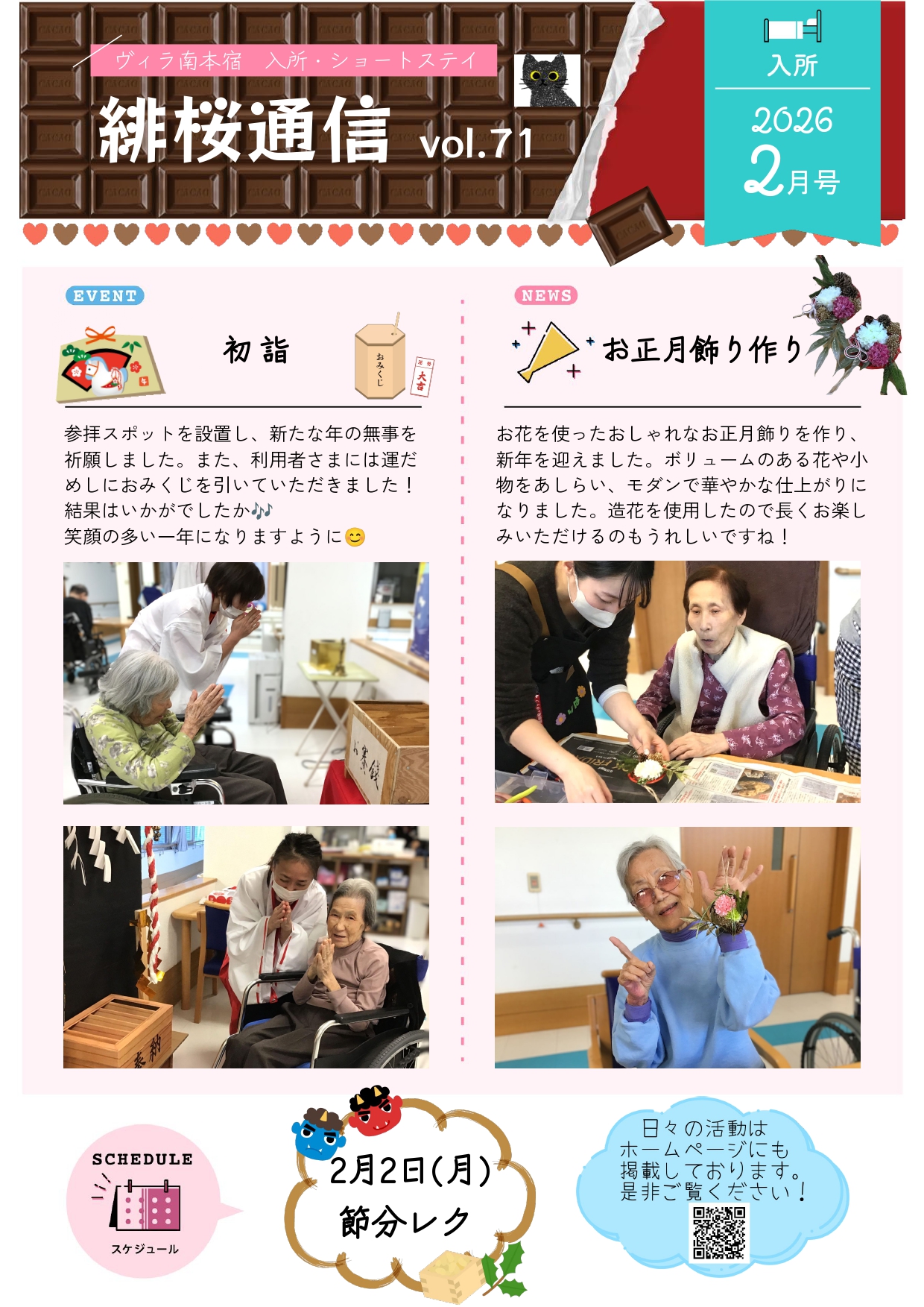 本日は「緋桜通信」2月号をご紹介いたします。 緋桜通信では、本入所・ショートステイでのイベントや、日々のレクリエーションを掲載しております。